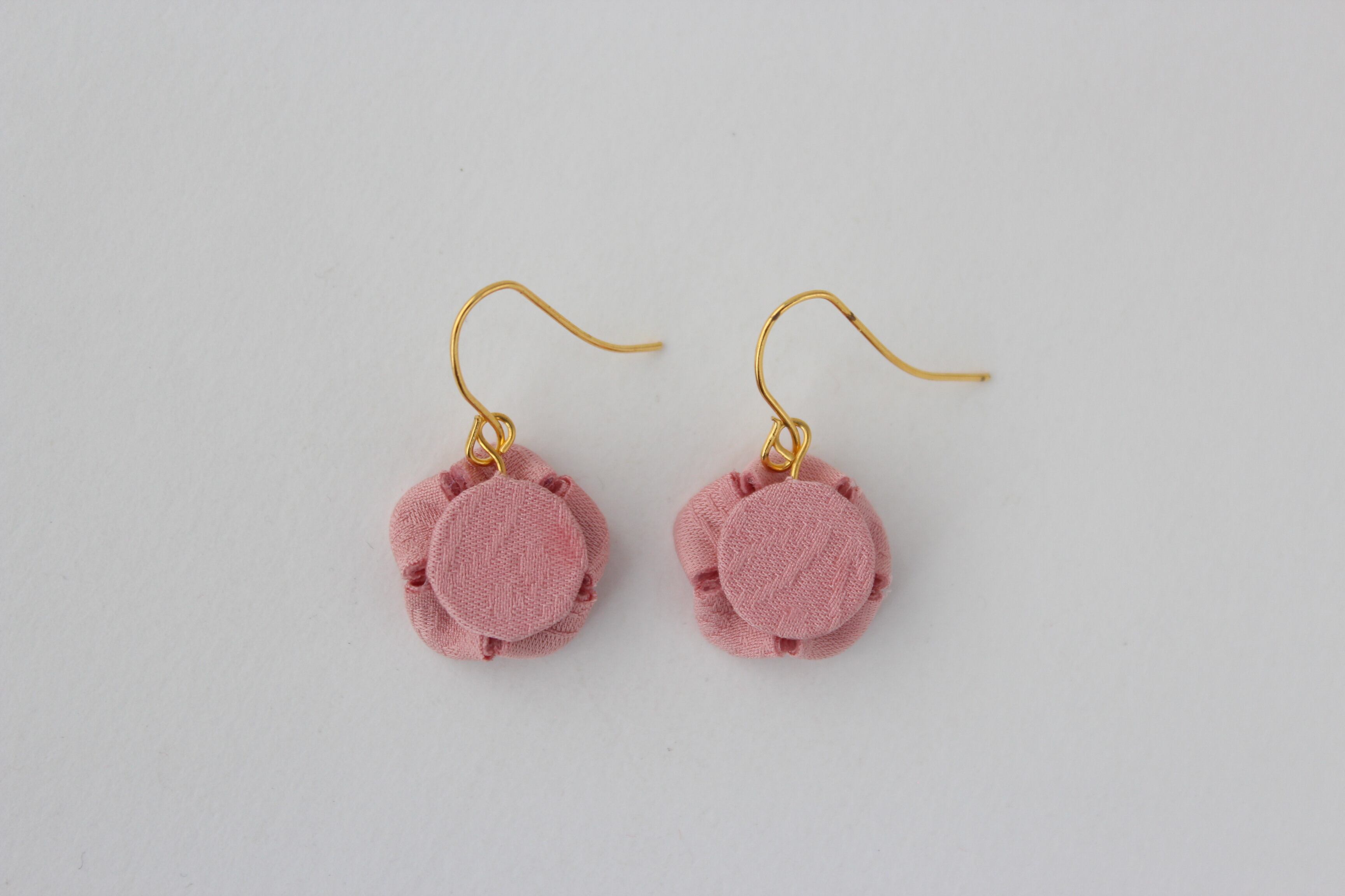 つまみ細工できたくすみがかったピンクのピアスできました。